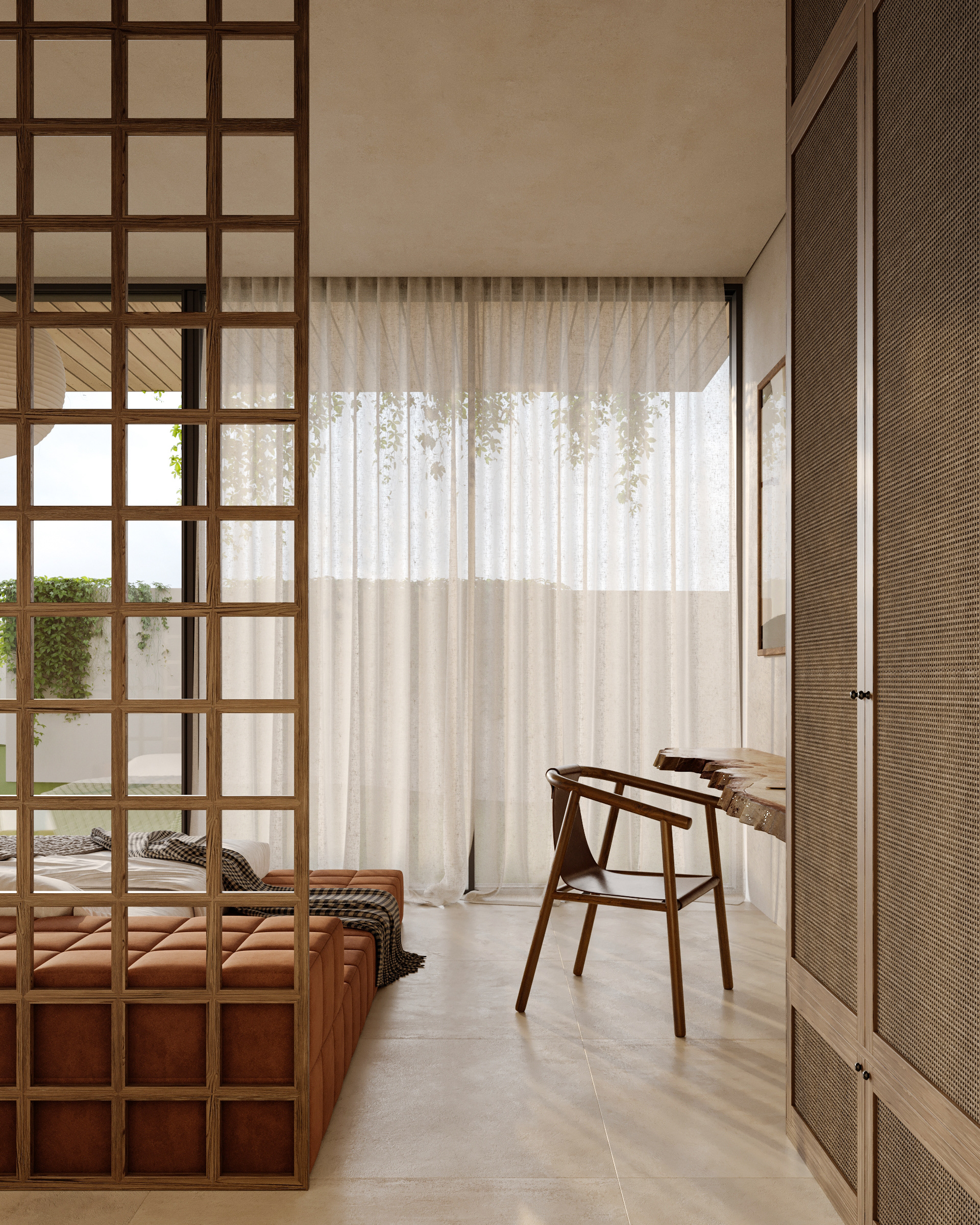 The overall light tone in a warm sandy palette brings the entire interior and exterior together. This technique does not allow you to be distracted by the external, does not get boring and immediately immerses you in the nature of the area.